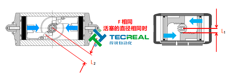 第二步,我們看兩者在扭矩轉換時的半徑。上圖為兩者工作時扭矩轉換半徑示意圖,左邊為撥叉式結構,右邊為齒輪齒條式結構。從圖中顯示的“L”值可以看到,左邊在進行扭矩轉換時,L值會變大,而右邊的齒輪齒條式則是永遠不變。經(jīng)過我們的測試,在活塞直徑相同的時候,OMAL的撥叉式氣動執(zhí)行器比普通的齒輪齒條式氣動執(zhí)行器的扭矩大40%左右。