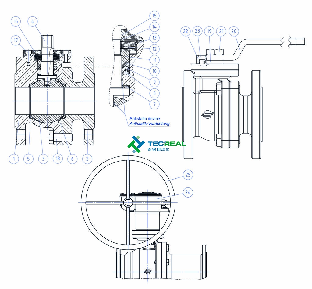 3.防靜電裝置(球體、閥桿和閥體間存在常電):此裝置可以避免在易燃或易爆環(huán)境中靜電荷的聚集。閥門(mén)在整個(gè)壽命周期中的接觸安全均具有保障。