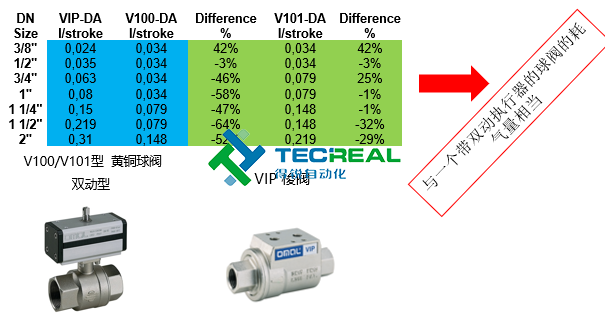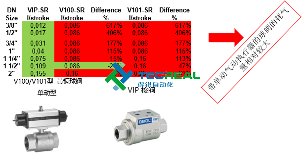 再來看與單動(dòng)V100或V101球閥的對(duì)比,測(cè)試結(jié)果顯示,帶單動(dòng)氣動(dòng)執(zhí)行器的球閥耗氣量相對(duì)較大。
