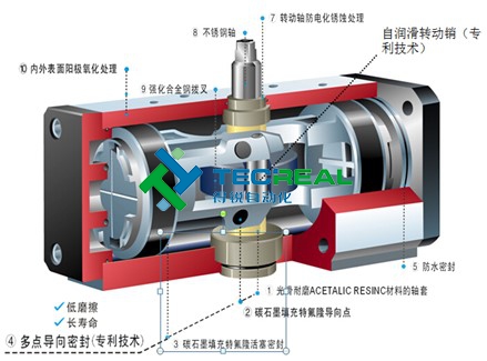 壓縮空氣進(jìn)入氣缸,推動(dòng)撥叉式活塞運(yùn)動(dòng),通過撥叉將活塞的直線運(yùn)動(dòng)轉(zhuǎn)為圓盤的旋轉(zhuǎn)運(yùn)動(dòng),圓盤帶動(dòng)輸出軸轉(zhuǎn)動(dòng),從而實(shí)現(xiàn)對閥門的控制。