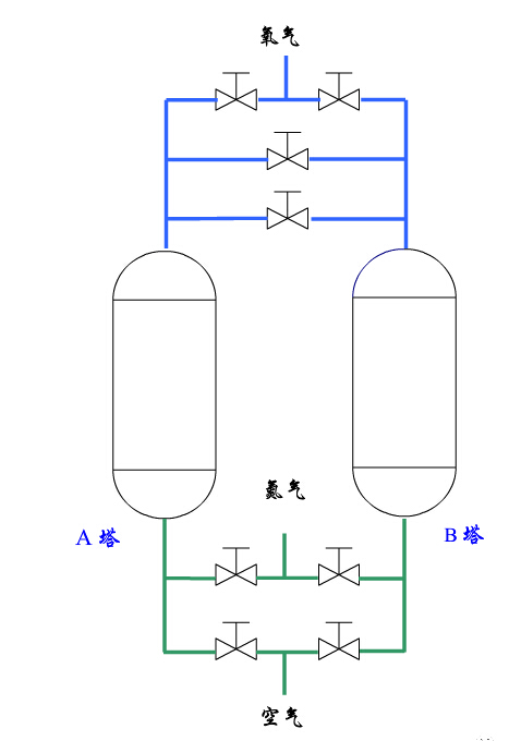 反之A塔吸附時B塔同時也在解吸。為使分子篩中降壓釋放出的氮氣完全排放到大氣中,氧氣通過一個常開的回吹閥吹掃正在解吸的吸附塔,把塔內(nèi)的殘留氮氣吹出吸附塔。這個過程稱之為回吹,它與解吸是同時進行的。
