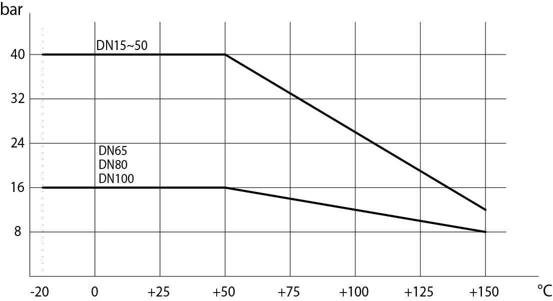 法蘭連接要求:符合EN 1092-1 PN40 至 DN50; PN16 DN65,50,100 EN 12516標(biāo)準(zhǔn)。